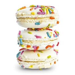 Layers of vanilla confetti cake, raspberry jam, and white chocolate mousse.